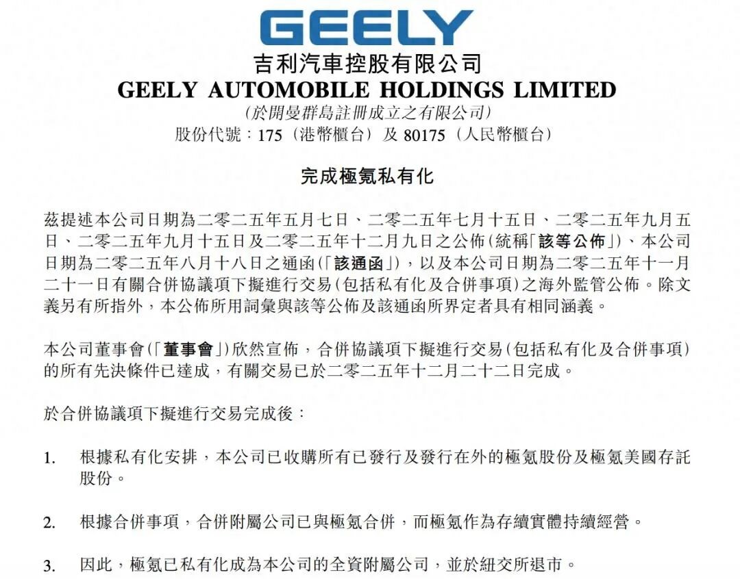 12月22日,吉利汽车发布公告称,已完成对极氪智能科技控股有限公司的私有化及合并交易。根据私有化安排,吉利汽车已收购所有已发行及发行在外的极氪股份及极氪美国存托股份;根据合并事项,合并附属公司已与极氪合并,而极氪作为存续实体持续经营;极氪成为吉利汽车的全资附属公司,并与纽交所退市。