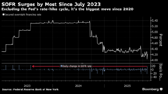 根据纽约联储周一公布的数据,截至10月31日,有担保隔夜融资利率(SOFR)升至4.22%。18个基点的升幅是自2023年(即美联储上一次加息时)以来的最大单日涨幅。若不计加息周期,这是自2020年3月以来最大单日波动。